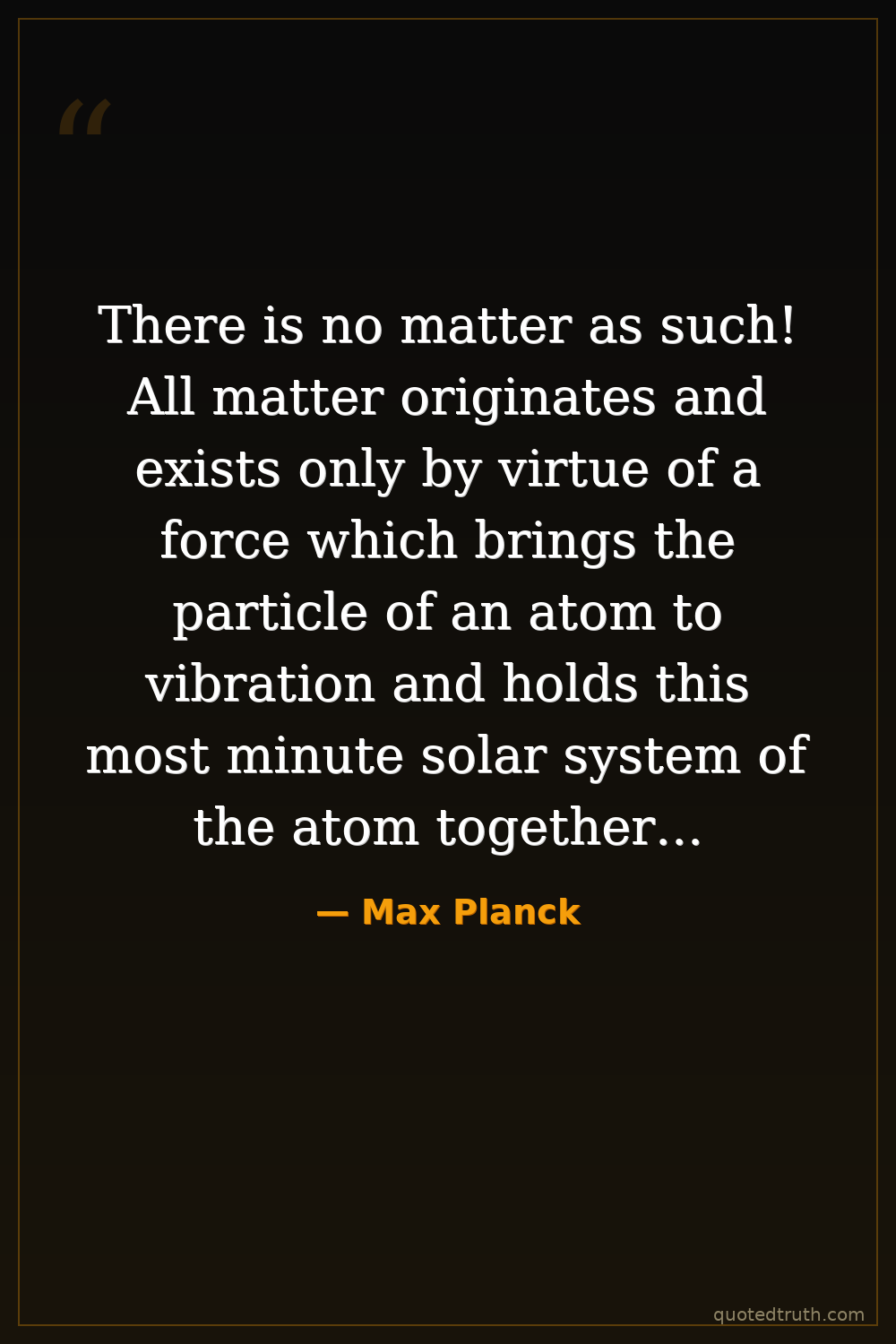 There is no matter as such! All matter originates and exists only by virtue of a force which brings the particle of an atom to vibration and holds this most minute solar system of the atom together. We must assume behind this force the existence of a conscious and intelligent mind. This mind is the matrix of all matter.