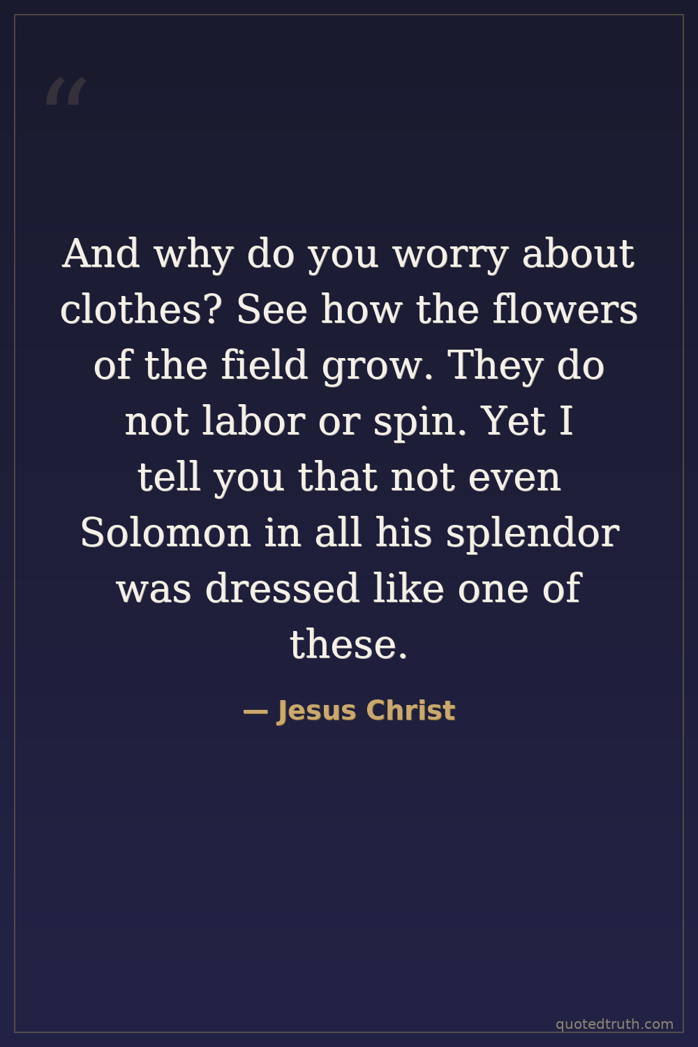 And why do you worry about clothes? See how the flowers of the field grow. They do not labor or spin. Yet I tell you that not even Solomon in all his splendor was dressed like one of these.