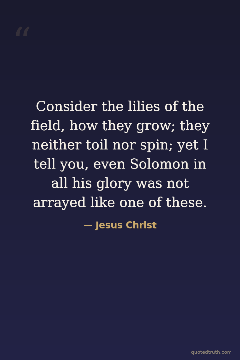 Consider the lilies of the field, how they grow; they neither toil nor spin; yet I tell you, even Solomon in all his glory was not arrayed like one of these.