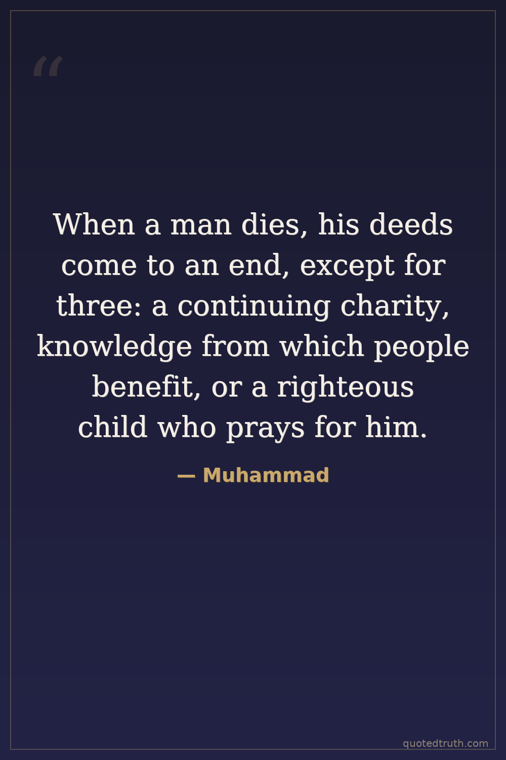 When a man dies, his deeds come to an end, except for three: a continuing charity, knowledge from which people benefit, or a righteous child who prays for him.
