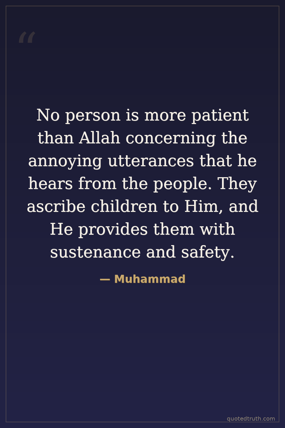 No person is more patient than Allah concerning the annoying utterances that he hears from the people. They ascribe children to Him, and He provides them with sustenance and safety.