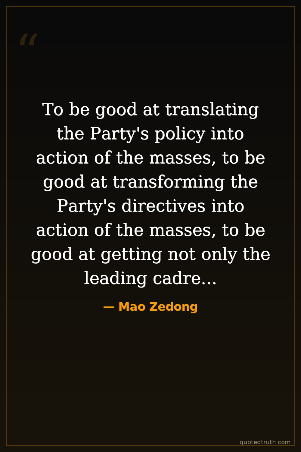 To be good at translating the Party's policy into action of the masses, to be good at transforming the Party's directives into action of the masses, to be good at getting not only the leading cadres but also the broad masses to understand and master every single struggle and every single task we are undertaking—this is the art of Marxist-Leninist leadership.