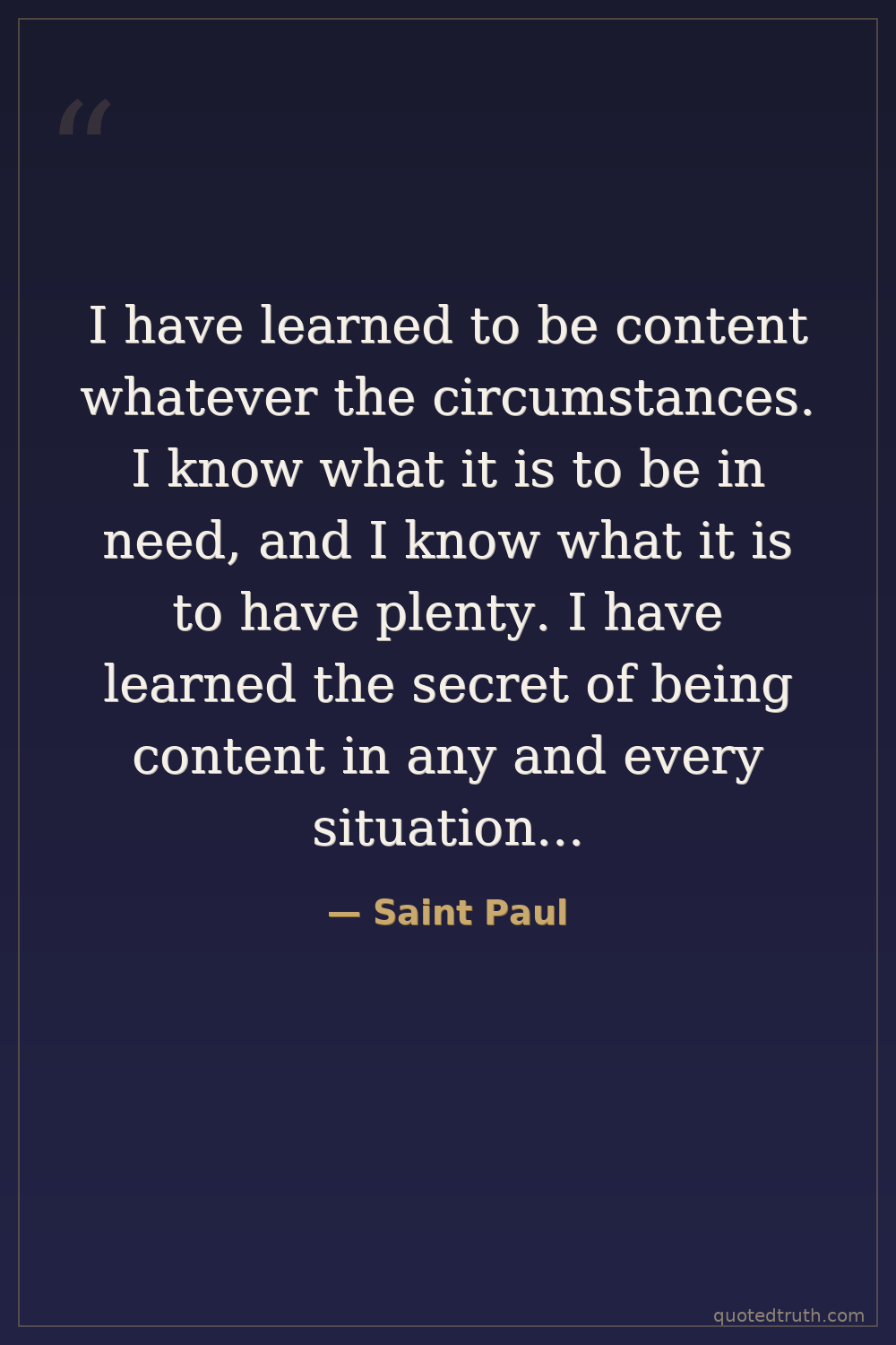 I have learned to be content whatever the circumstances. I know what it is to be in need, and I know what it is to have plenty. I have learned the secret of being content in any and every situation, whether well fed or hungry, whether living in plenty or in want.
