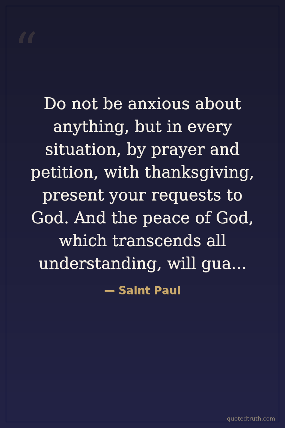 Do not be anxious about anything, but in every situation, by prayer and petition, with thanksgiving, present your requests to God. And the peace of God, which transcends all understanding, will guard your hearts and your minds in Christ Jesus.