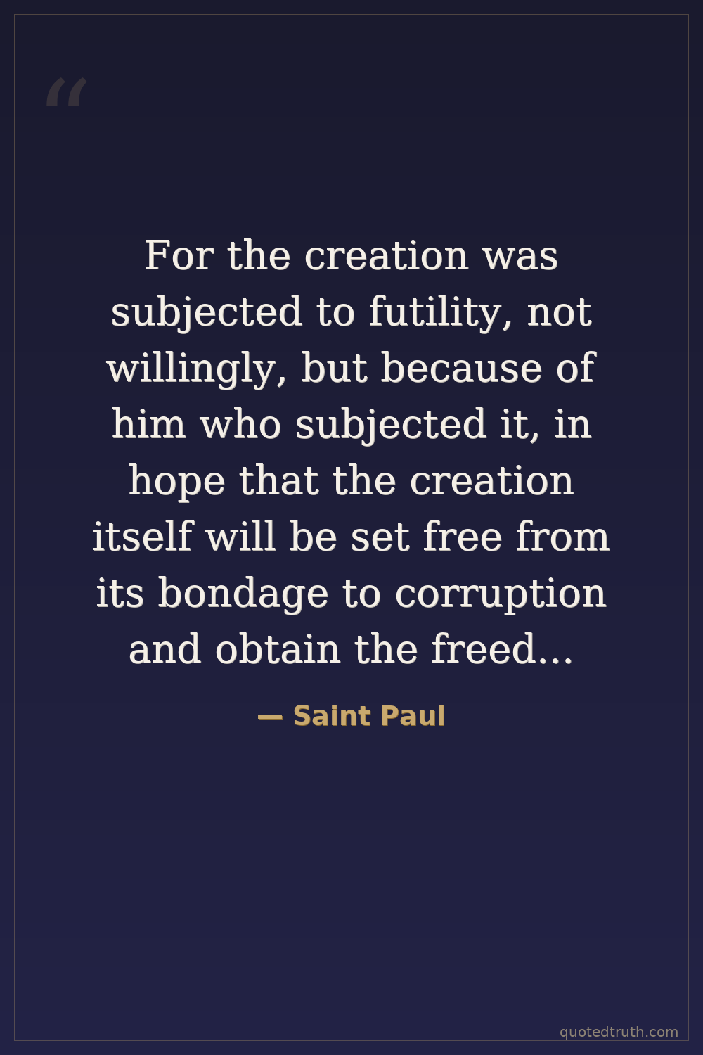 For the creation was subjected to futility, not willingly, but because of him who subjected it, in hope that the creation itself will be set free from its bondage to corruption and obtain the freedom of the glory of the children of God.