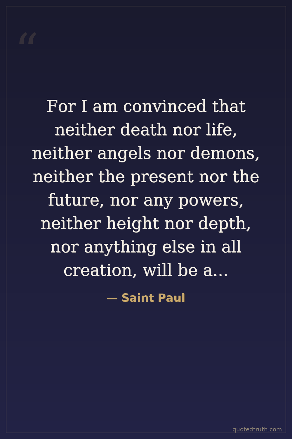 For I am convinced that neither death nor life, neither angels nor demons, neither the present nor the future, nor any powers, neither height nor depth, nor anything else in all creation, will be able to separate us from the love of God that is in Christ Jesus our Lord.