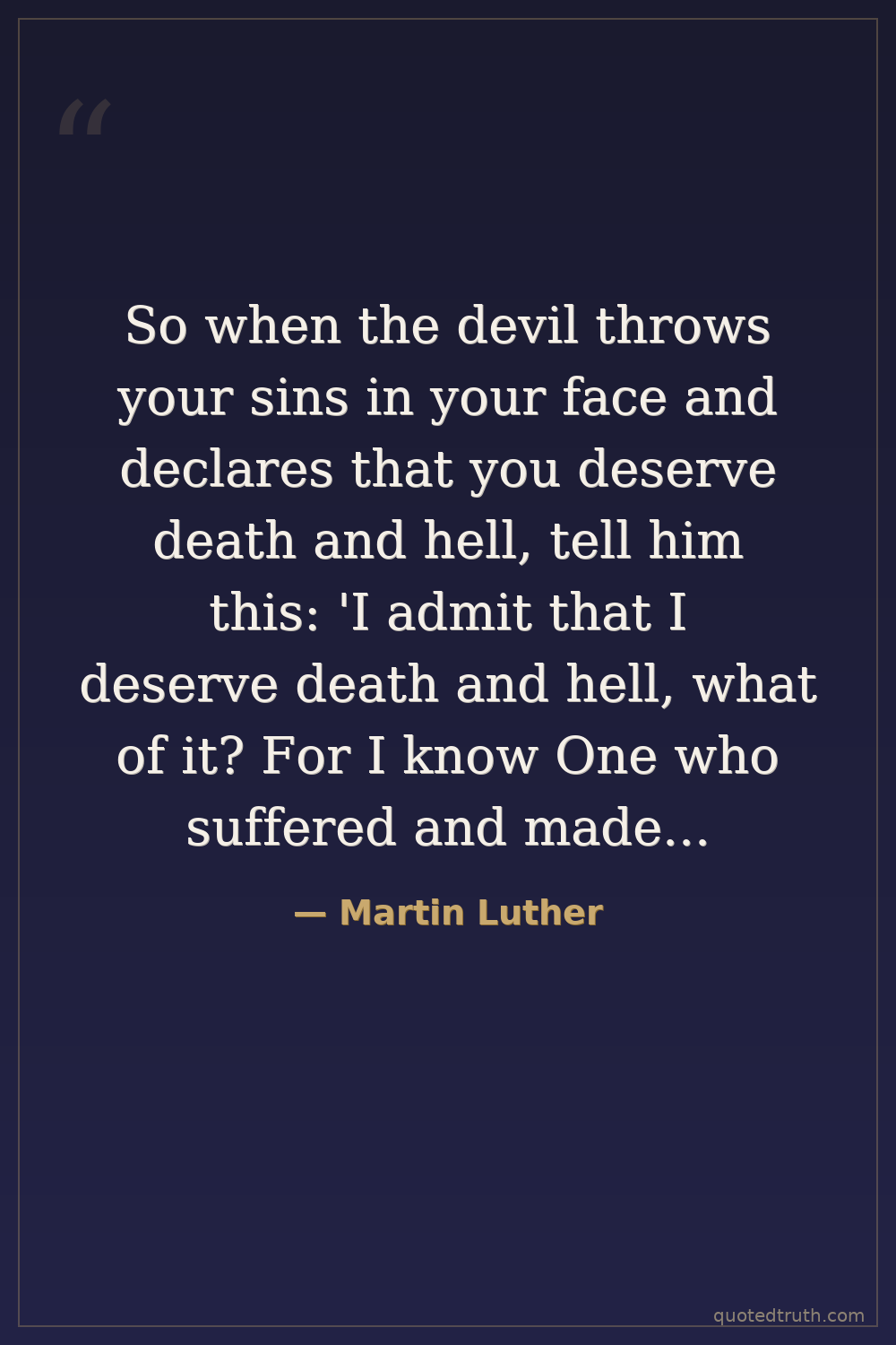 So when the devil throws your sins in your face and declares that you deserve death and hell, tell him this: 'I admit that I deserve death and hell, what of it? For I know One who suffered and made satisfaction on my behalf. His name is Jesus Christ, Son of God, and where He is there I shall be also!'