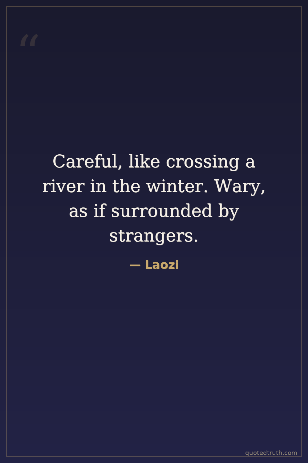 Careful, like crossing a river in the winter. Wary, as if surrounded by strangers.