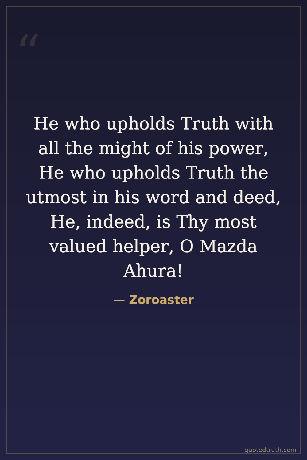 He who upholds Truth with all the might of his power, He who upholds Truth the utmost in his word and deed, He, indeed, is Thy most valued helper, O Mazda Ahura!