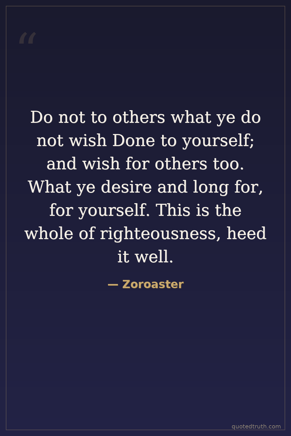 Do not to others what ye do not wish Done to yourself; and wish for others too. What ye desire and long for, for yourself. This is the whole of righteousness, heed it well.