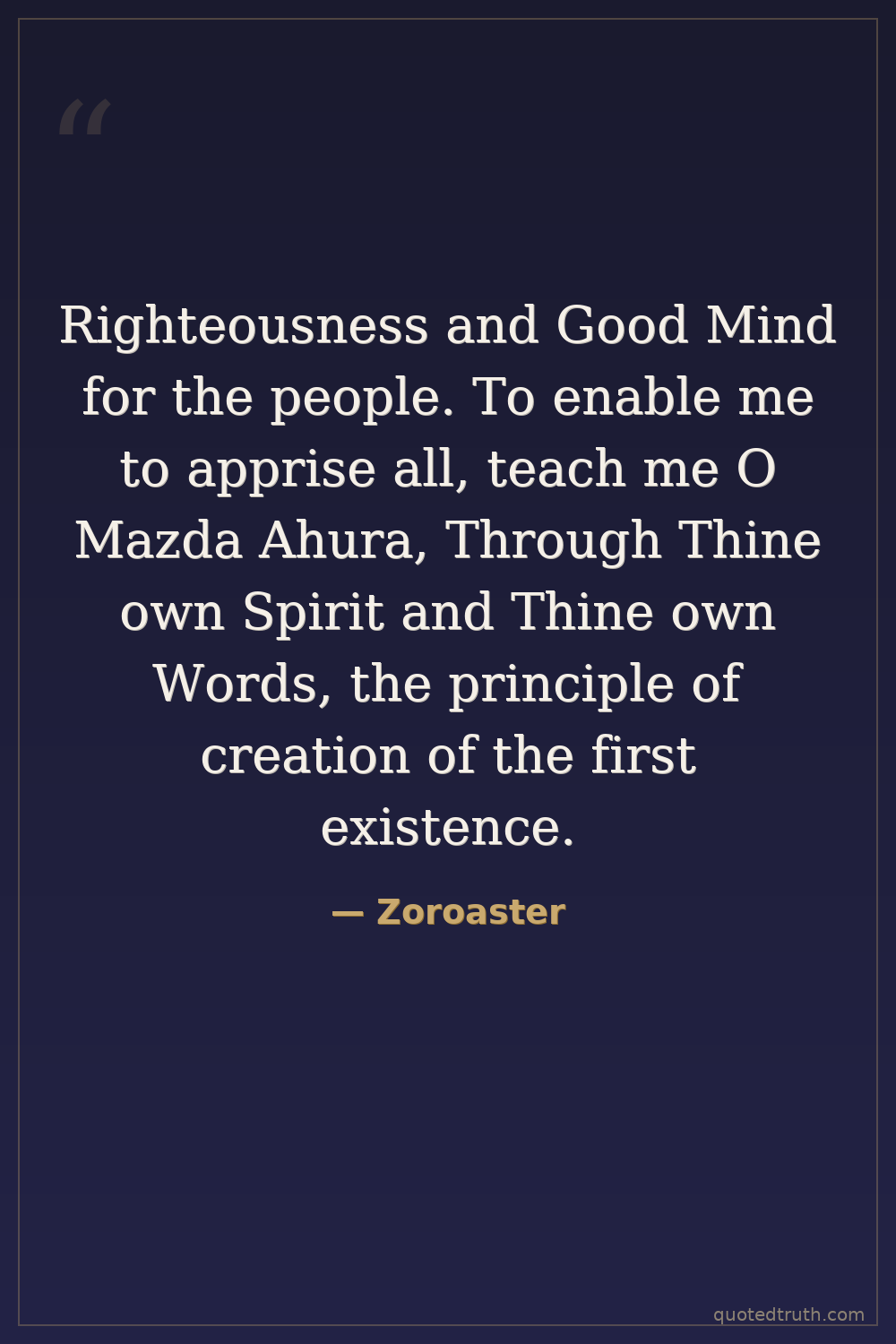 Righteousness and Good Mind for the people. To enable me to apprise all, teach me O Mazda Ahura, Through Thine own Spirit and Thine own Words, the principle of creation of the first existence.