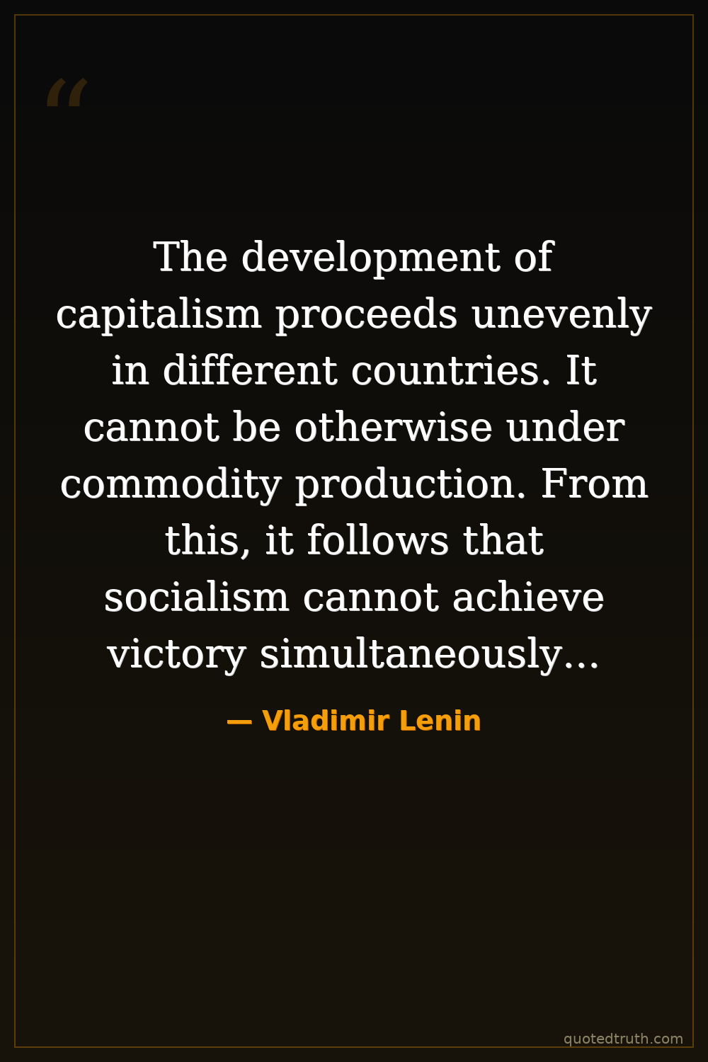 The development of capitalism proceeds unevenly in different countries. It cannot be otherwise under commodity production. From this, it follows that socialism cannot achieve victory simultaneously in all countries. It will achieve victory first in one or several countries, while the others will remain bourgeois or pre-bourgeois for some time.