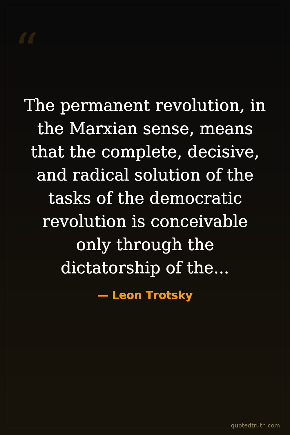 The permanent revolution, in the Marxian sense, means that the complete, decisive, and radical solution of the tasks of the democratic revolution is conceivable only through the dictatorship of the proletariat, which, having become the leader of the nation, also and above all of the peasant masses, puts on the order of the day the tasks of the socialist revolution.