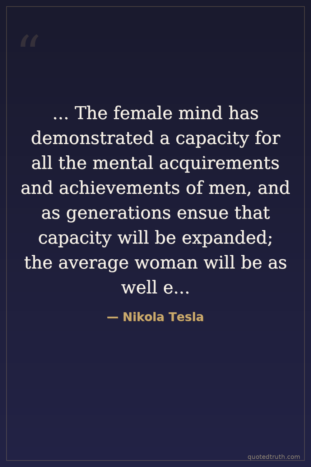 ... The female mind has demonstrated a capacity for all the mental acquirements and achievements of men, and as generations ensue that capacity will be expanded; the average woman will be as well educated as the average man, and then better educated, for the dormant faculties of her brain will be stimulated to an activity that will be all the more intense and powerful because of centuries of repose. Woman will ignore precedent and startle civilization with their progress.