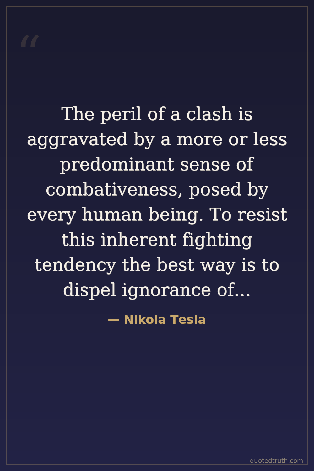 The peril of a clash is aggravated by a more or less predominant sense of combativeness, posed by every human being. To resist this inherent fighting tendency the best way is to dispel ignorance of the doings of others by a systematic spread of general knowledge. With this object in view, it is most important to aid exchange of thought and intercourse.