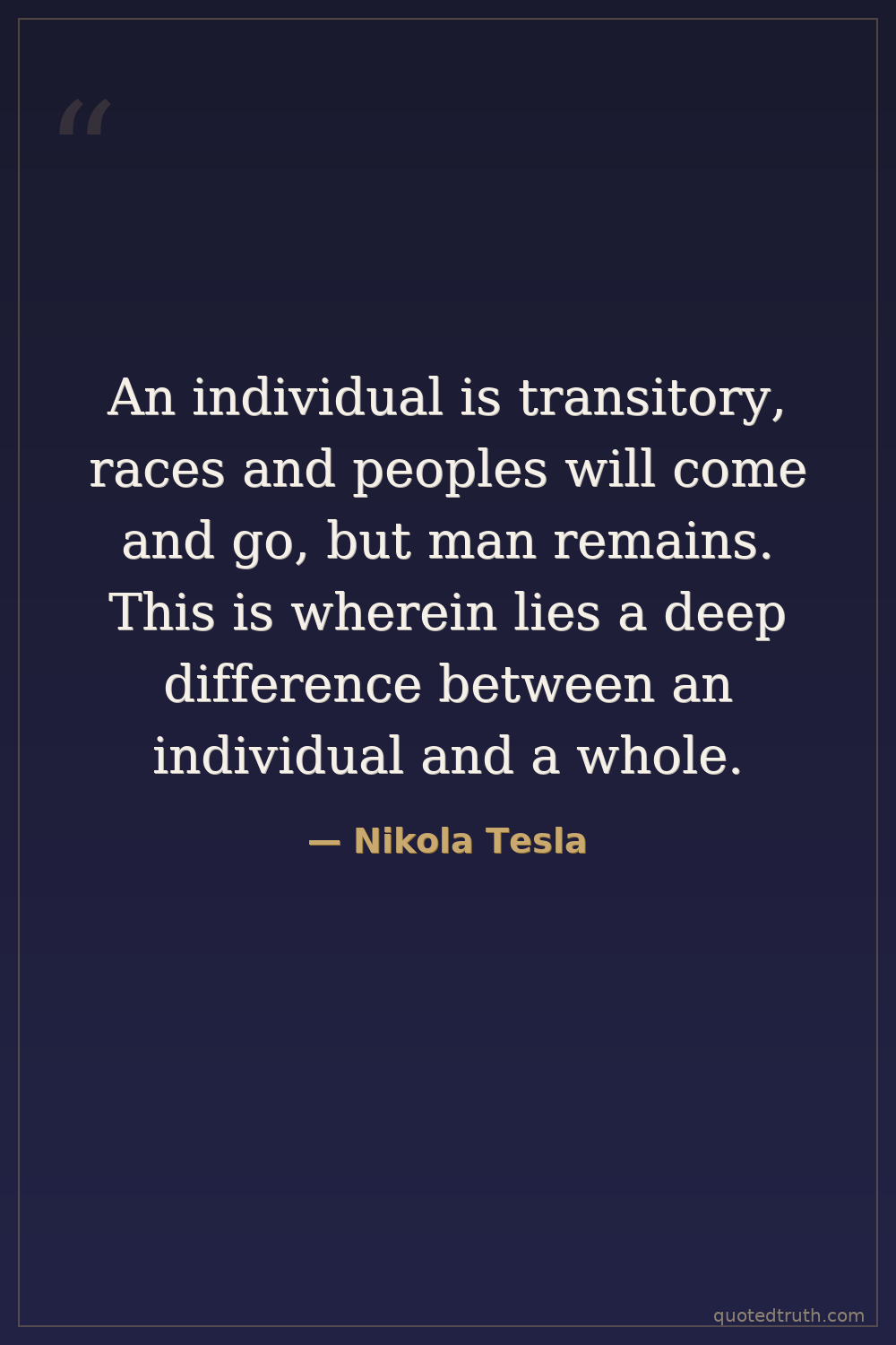 An individual is transitory, races and peoples will come and go, but man remains. This is wherein lies a deep difference between an individual and a whole.