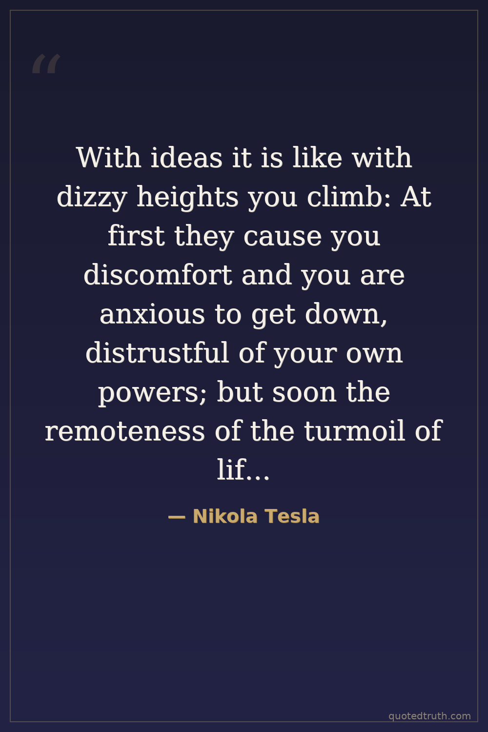 With ideas it is like with dizzy heights you climb: At first they cause you discomfort and you are anxious to get down, distrustful of your own powers; but soon the remoteness of the turmoil of life and the inspiring influence of the altitude calm your blood; your step gets firm and sure and you begin to look – for dizzier heights.