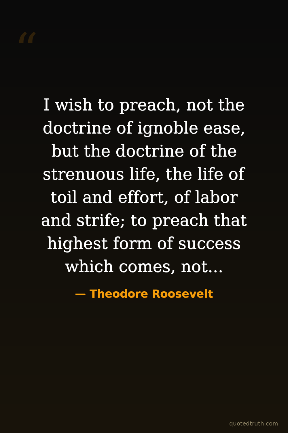 I wish to preach, not the doctrine of ignoble ease, but the doctrine of the strenuous life, the life of toil and effort, of labor and strife; to preach that highest form of success which comes, not to the man who desires mere peace, but to the man who does not shrink from danger, from hardship, or from bitter toil, and who out of these wins the splendid ultimate triumph.