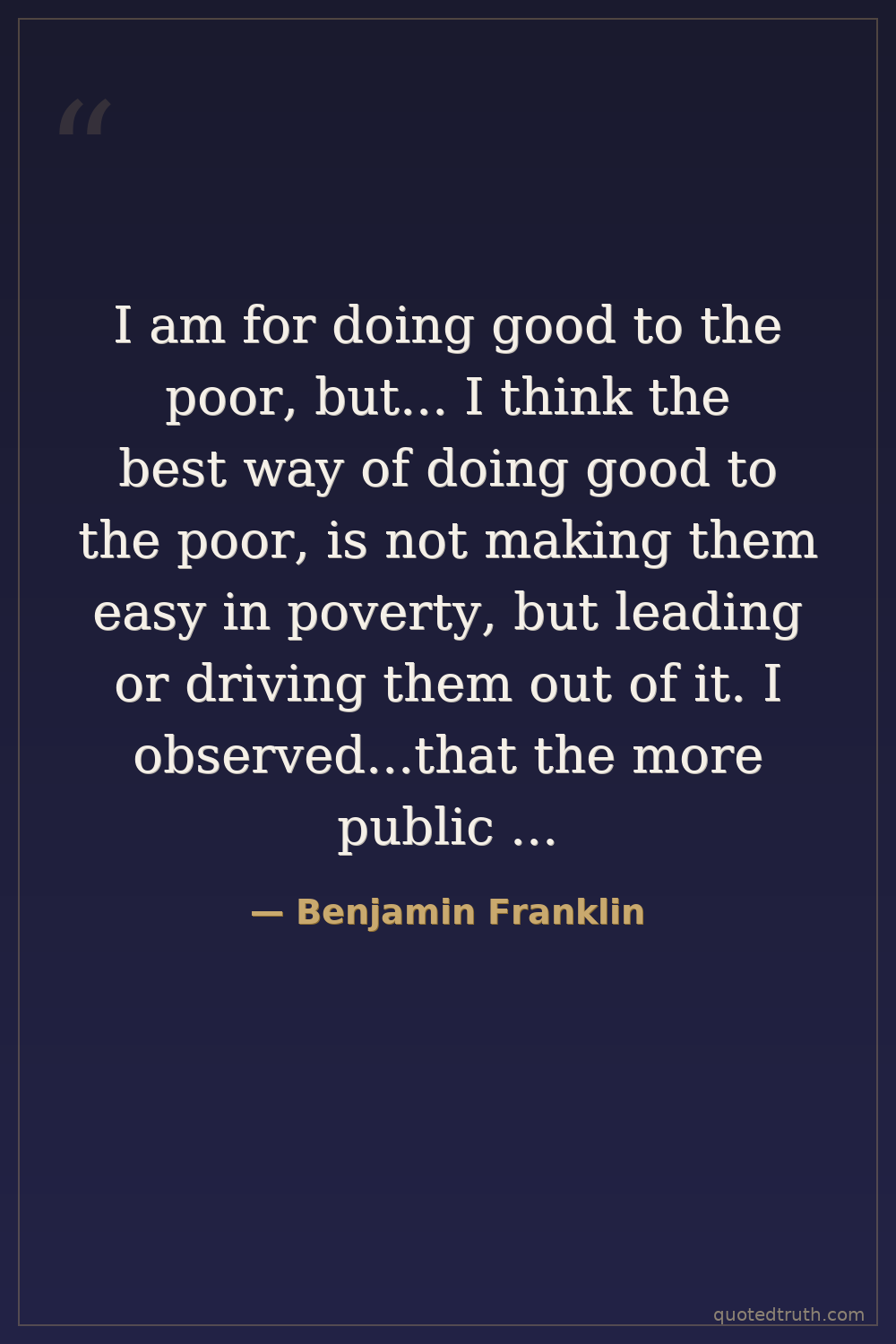 I am for doing good to the poor, but... I think the best way of doing good to the poor, is not making them easy in poverty, but leading or driving them out of it. I observed...that the more public provisions were made for the poor, the less they provided for themselves, and of course became poorer. And, on the contrary, the less was done for them, the more they did for themselves, and became richer.