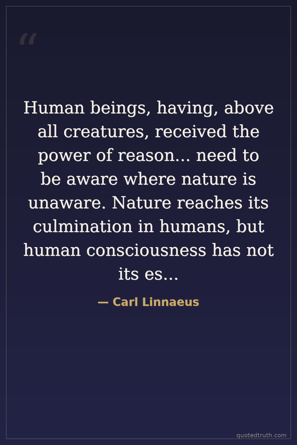Human beings, having, above all creatures, received the power of reason... need to be aware where nature is unaware. Nature reaches its culmination in humans, but human consciousness has not its essence in itself or nature.