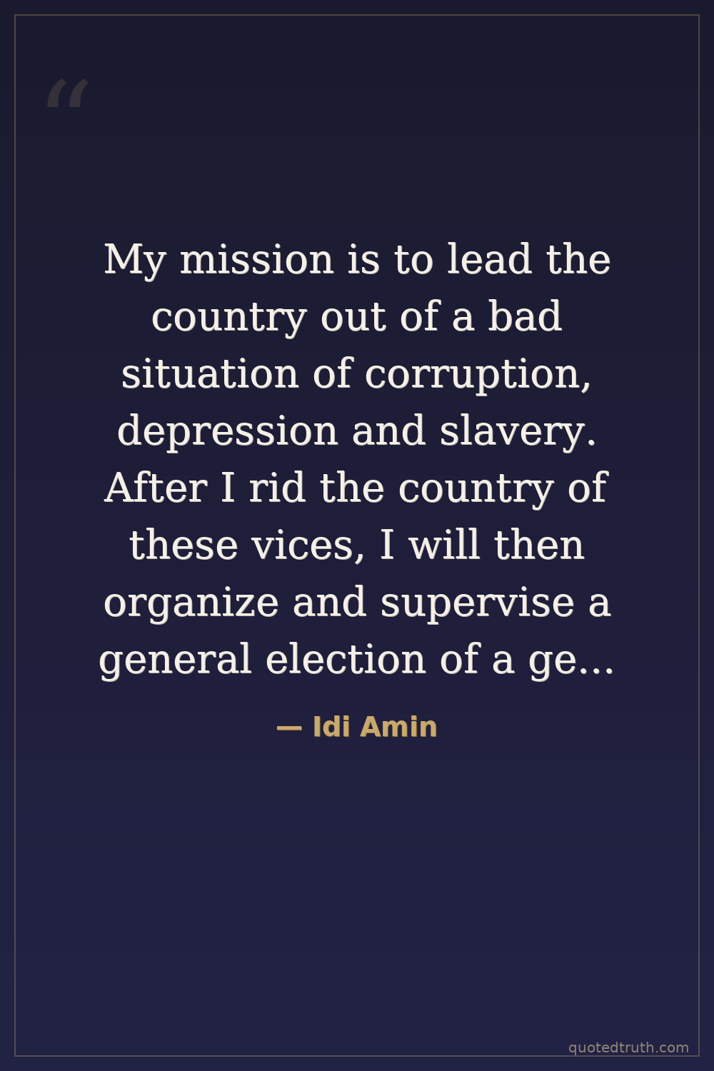 My mission is to lead the country out of a bad situation of corruption, depression and slavery. After I rid the country of these vices, I will then organize and supervise a general election of a genuinely democratic civilian government.
