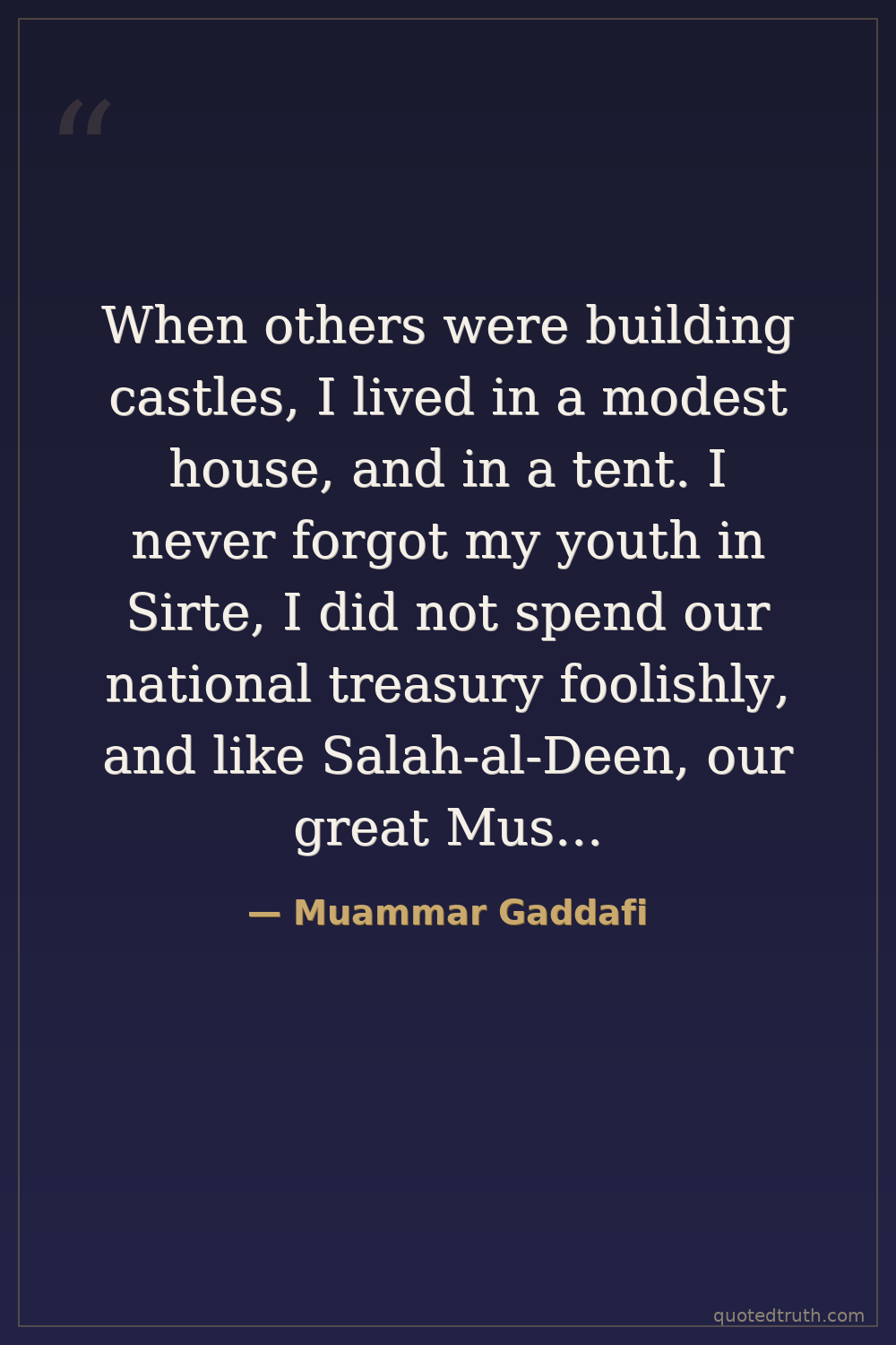 When others were building castles, I lived in a modest house, and in a tent. I never forgot my youth in Sirte, I did not spend our national treasury foolishly, and like Salah-al-Deen, our great Muslim leader, who rescued Jerusalem for Islam, I took little for myself…