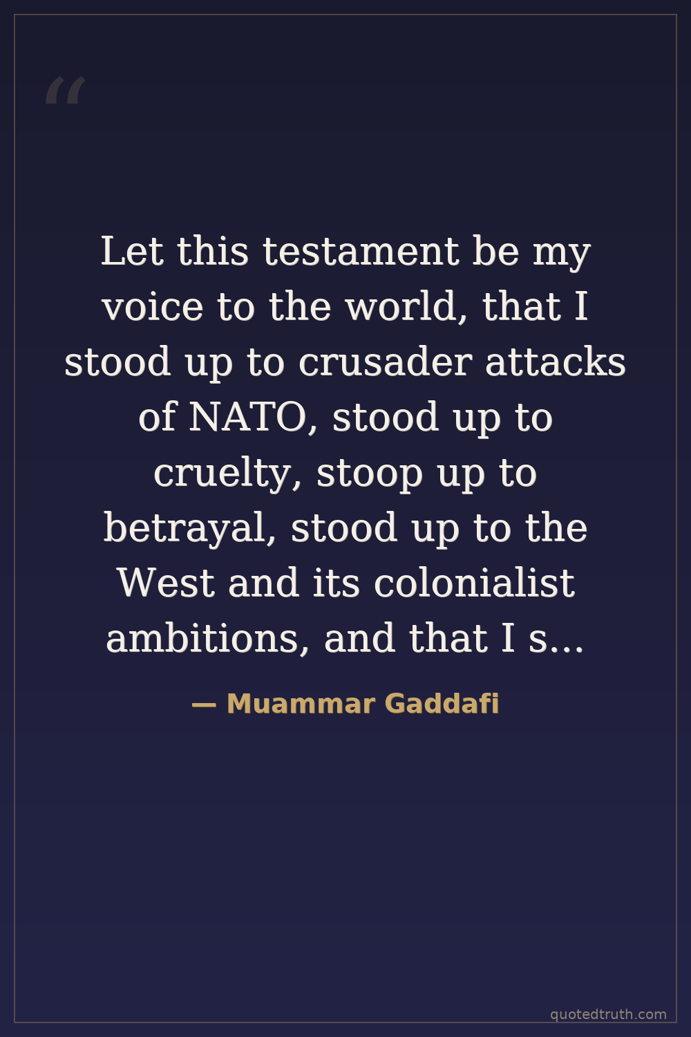 Let this testament be my voice to the world, that I stood up to crusader attacks of NATO, stood up to cruelty, stoop up to betrayal, stood up to the West and its colonialist ambitions, and that I stood with my African brothers, my true Arab and Muslim brothers, as a beacon of light.