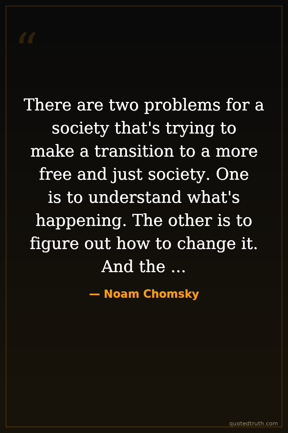 There are two problems for a society that's trying to make a transition to a more free and just society. One is to understand what's happening. The other is to figure out how to change it. And the second is much harder. — Noam Chomsky Contemporary Linguistics, political activism