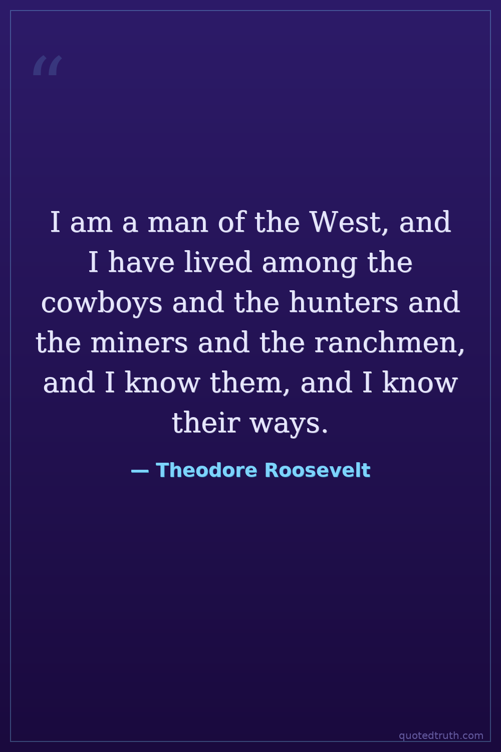 I am a man of the West, and I have lived among the cowboys and the hunters and the miners and the ranchmen, and I know them, and I know their ways.