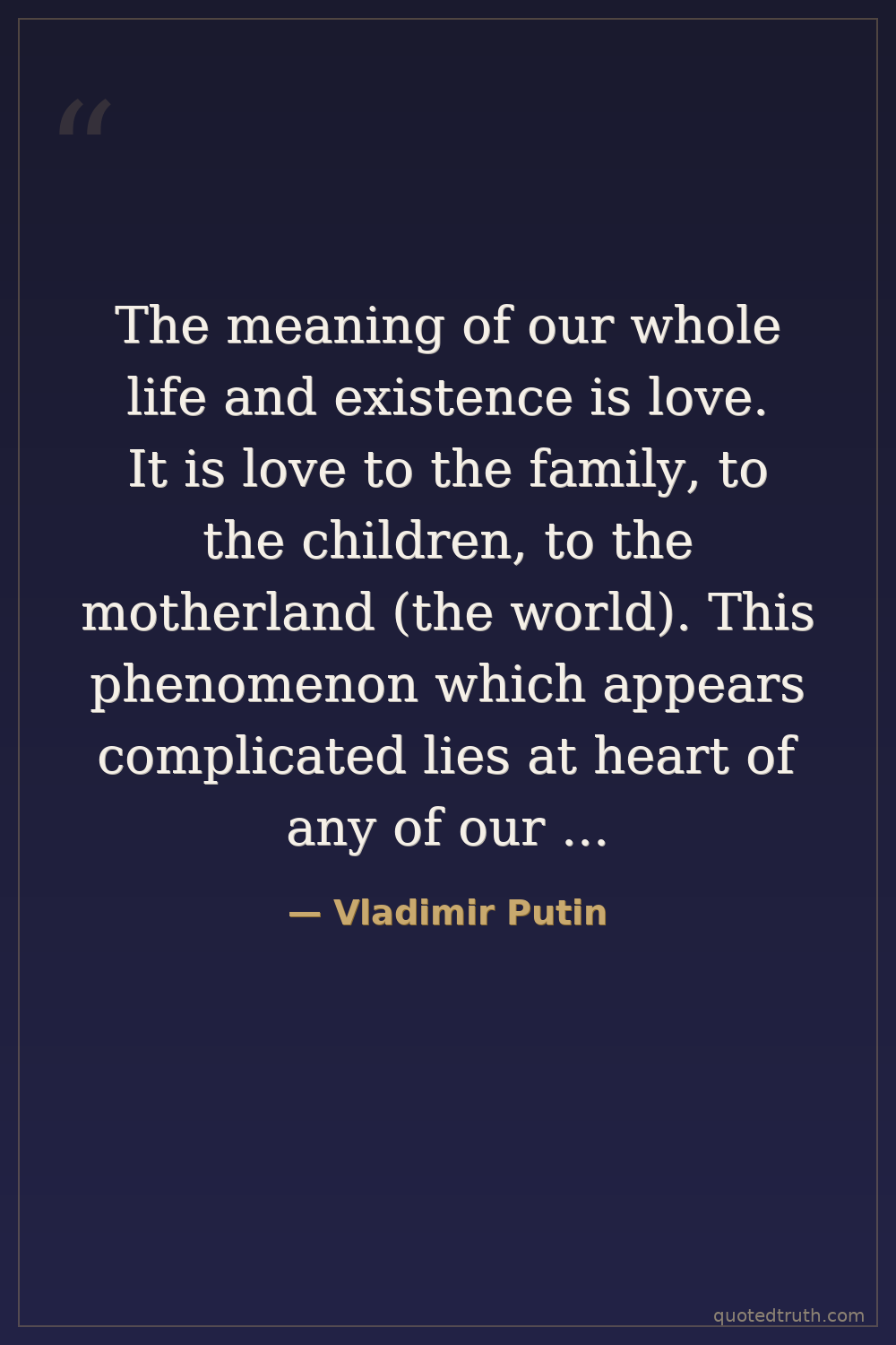 The meaning of our whole life and existence is love. It is love to the family, to the children, to the motherland (the world). This phenomenon which appears complicated lies at heart of any of our behaviors. It is exactly the top priority which all of us should go after, and I am absolutely sure that we will succeed.