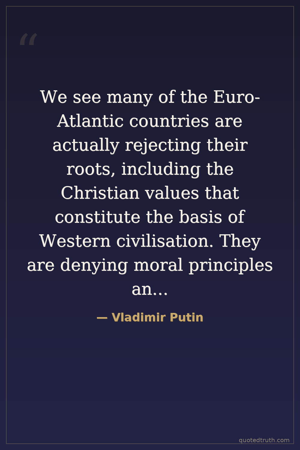 We see many of the Euro-Atlantic countries are actually rejecting their roots, including the Christian values that constitute the basis of Western civilisation. They are denying moral principles and all traditional identities: national, cultural, religious and even sexual. They are implementing policies that equate large families with same-sex partnerships, belief in God with the belief in Satan.