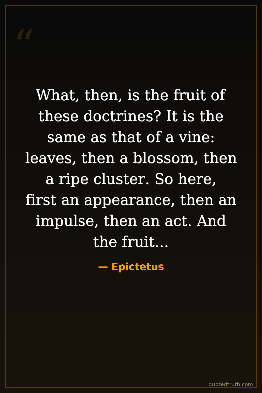 What, then, is the fruit of these doctrines? It is the same as that of a vine: leaves, then a blossom, then a ripe cluster. So here, first an appearance, then an impulse, then an act. And the fruit is this: freedom from disturbance, fear, and trouble; freedom from pain.