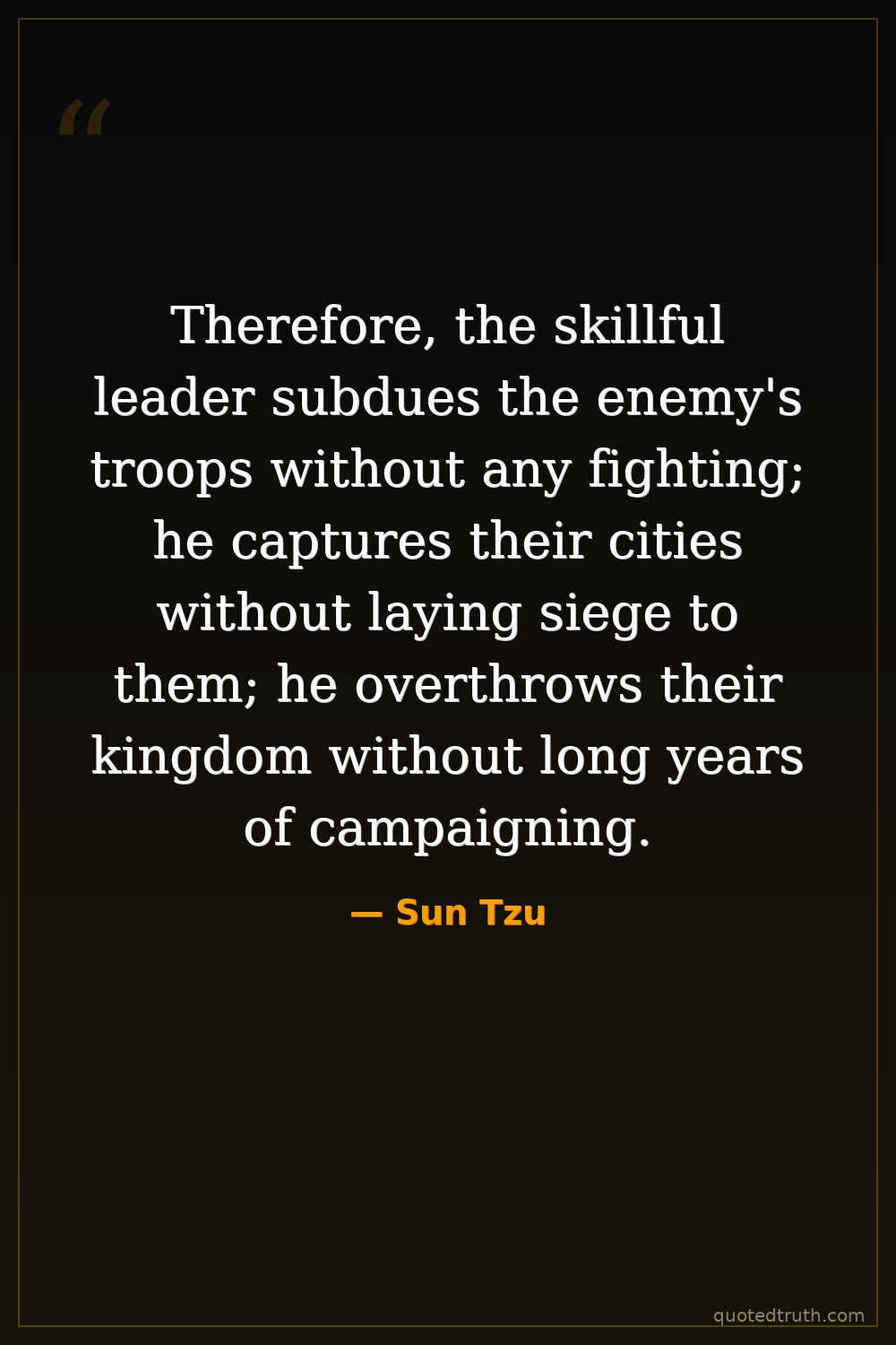 Therefore, the skillful leader subdues the enemy's troops without any fighting; he captures their cities without laying siege to them; he overthrows their kingdom without long years of campaigning.