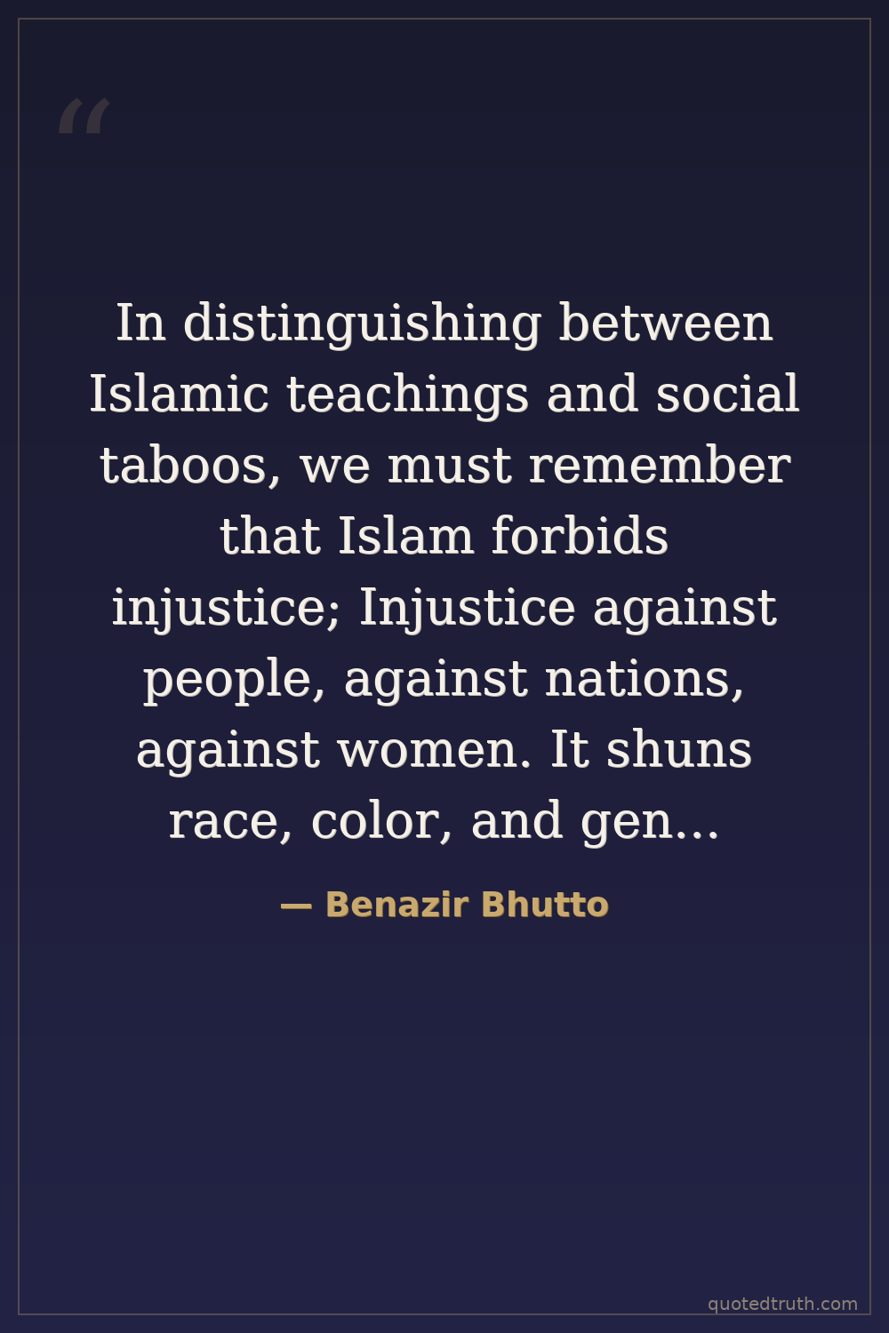 In distinguishing between Islamic teachings and social taboos, we must remember that Islam forbids injustice; Injustice against people, against nations, against women. It shuns race, color, and gender as a basis of distinction amongst fellowmen. It enshrines piety as the sole criteria for judging humankind.