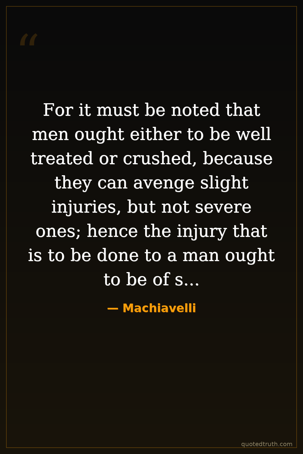 For it must be noted that men ought either to be well treated or crushed, because they can avenge slight injuries, but not severe ones; hence the injury that is to be done to a man ought to be of such a kind that one does not stand in fear of revenge.