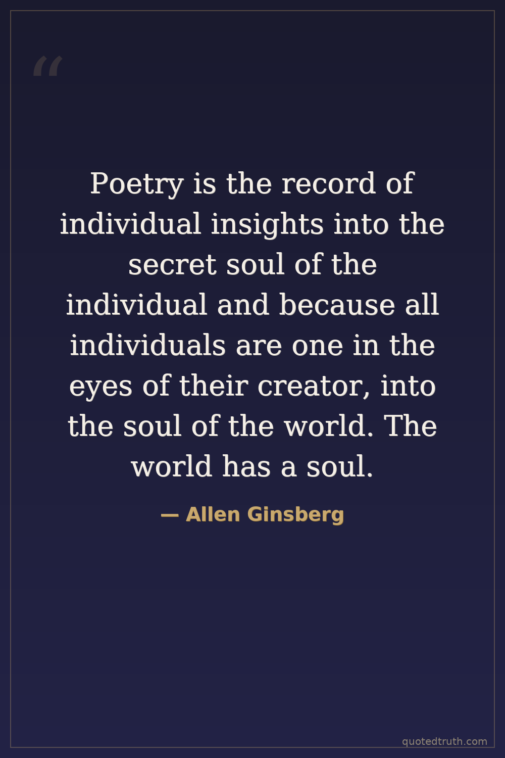 Poetry is the record of individual insights into the secret soul of the individual and because all individuals are one in the eyes of their creator, into the soul of the world. The world has a soul.