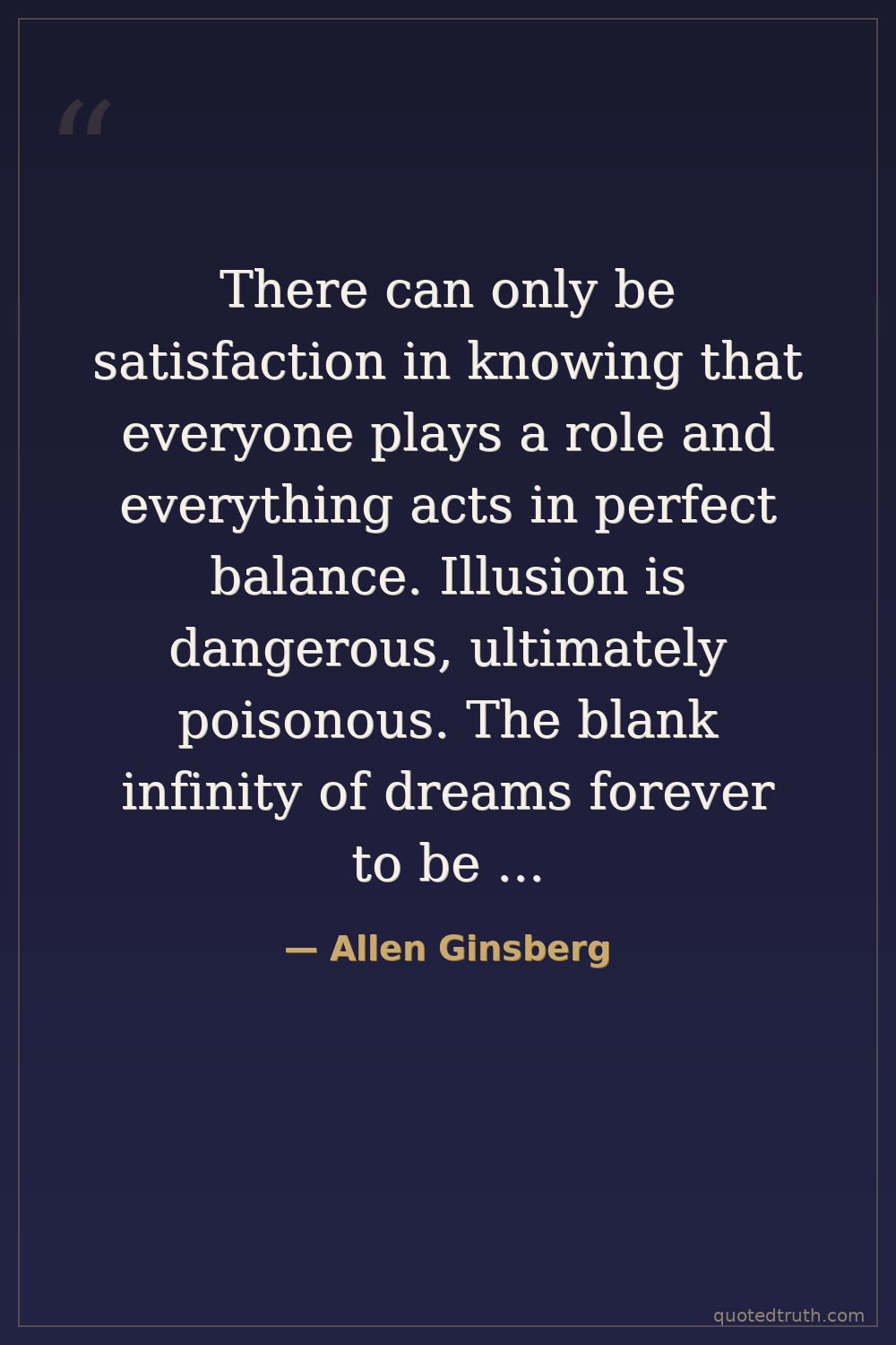 There can only be satisfaction in knowing that everyone plays a role and everything acts in perfect balance. Illusion is dangerous, ultimately poisonous. The blank infinity of dreams forever to be tempered with reality.