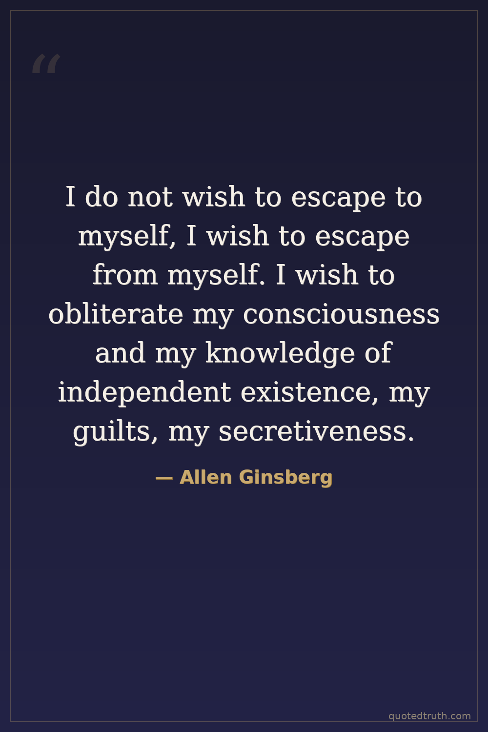 I do not wish to escape to myself, I wish to escape from myself. I wish to obliterate my consciousness and my knowledge of independent existence, my guilts, my secretiveness.