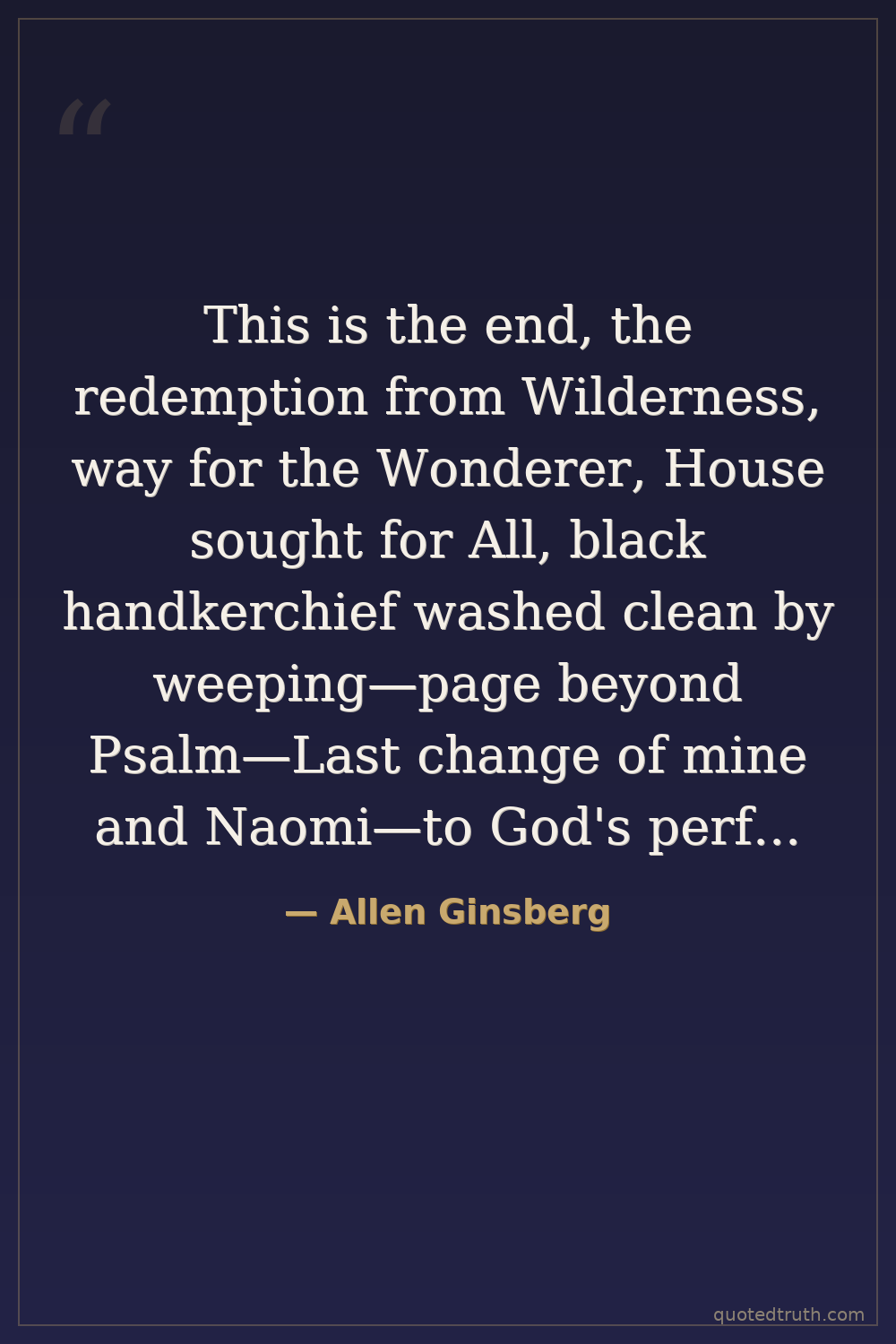 This is the end, the redemption from Wilderness, way for the Wonderer, House sought for All, black handkerchief washed clean by weeping—page beyond Psalm—Last change of mine and Naomi—to God's perfect Darkness—Death, stay thy phantoms!