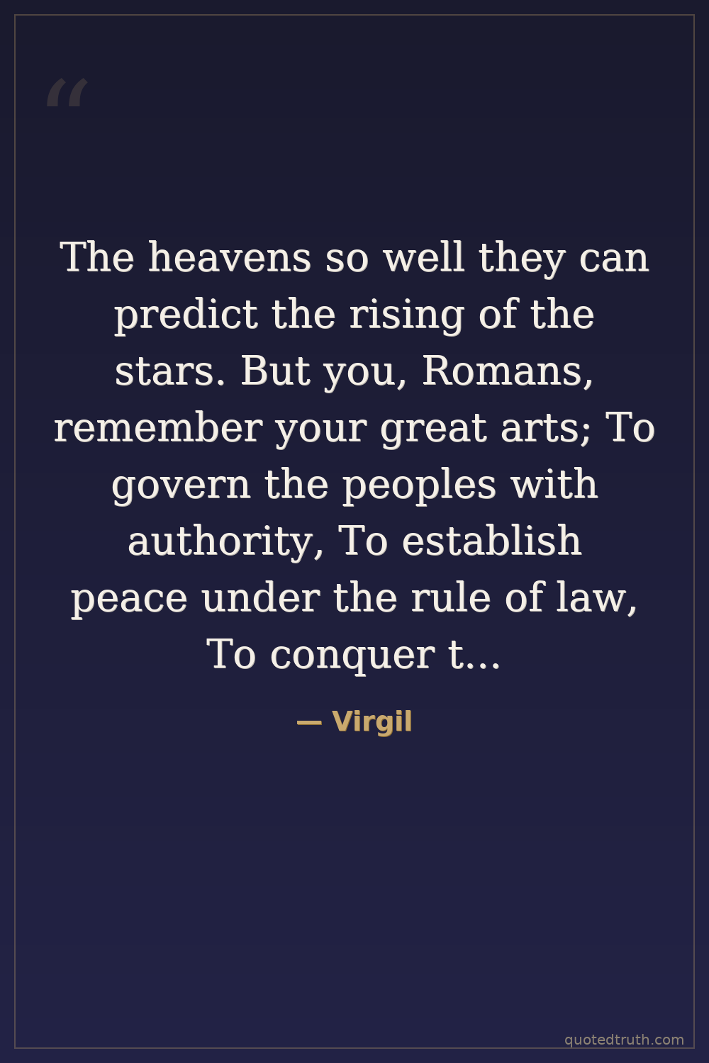 The heavens so well they can predict the rising of the stars. But you, Romans, remember your great arts; To govern the peoples with authority, To establish peace under the rule of law, To conquer the mighty, and show them mercy once they are conquered.