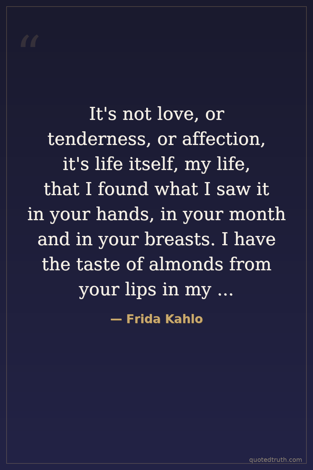 It's not love, or tenderness, or affection, it's life itself, my life, that I found what I saw it in your hands, in your month and in your breasts. I have the taste of almonds from your lips in my mouth. Our worlds have never gone outside. Only one mountain can know the core of another mountain.