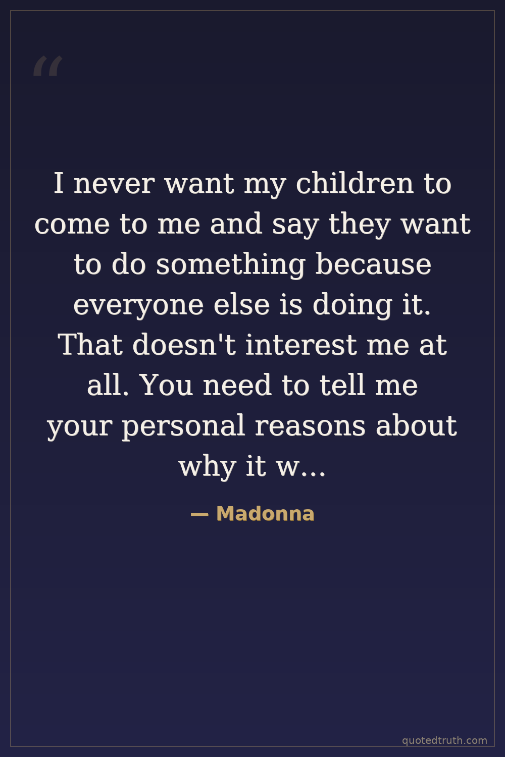 I never want my children to come to me and say they want to do something because everyone else is doing it. That doesn't interest me at all. You need to tell me your personal reasons about why it will benefit you, what you're going to get out of it, what it means to you. Otherwise, you're just a robot. You're not thinking for yourself.