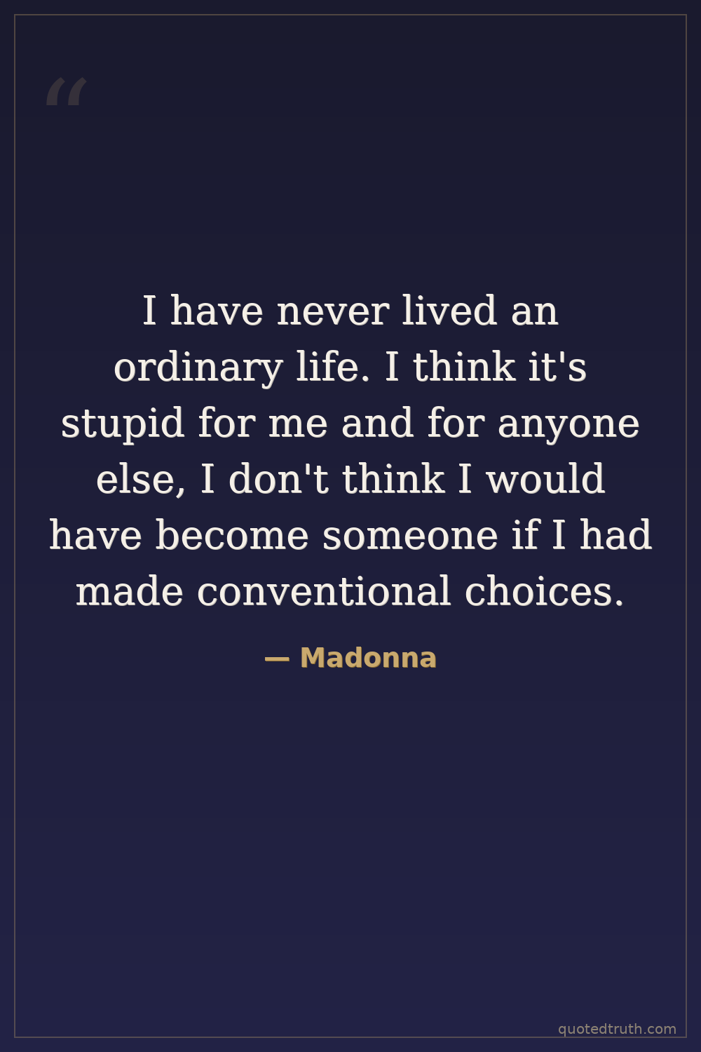 I have never lived an ordinary life. I think it's stupid for me and for anyone else, I don't think I would have become someone if I had made conventional choices.