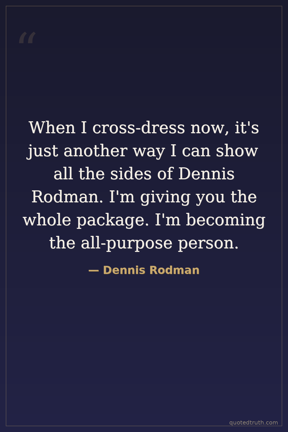 When I cross-dress now, it's just another way I can show all the sides of Dennis Rodman. I'm giving you the whole package. I'm becoming the all-purpose person.