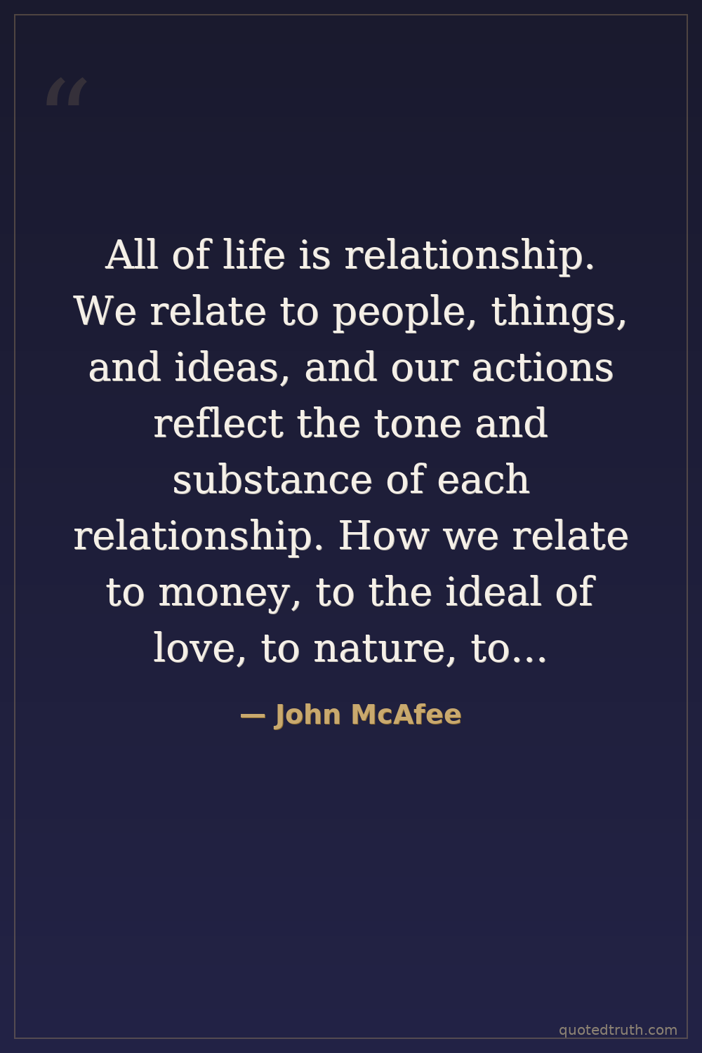 All of life is relationship. We relate to people, things, and ideas, and our actions reflect the tone and substance of each relationship. How we relate to money, to the ideal of love, to nature, to our concept of death, and to our spouse reveals, in the moment, the truth of ourselves.