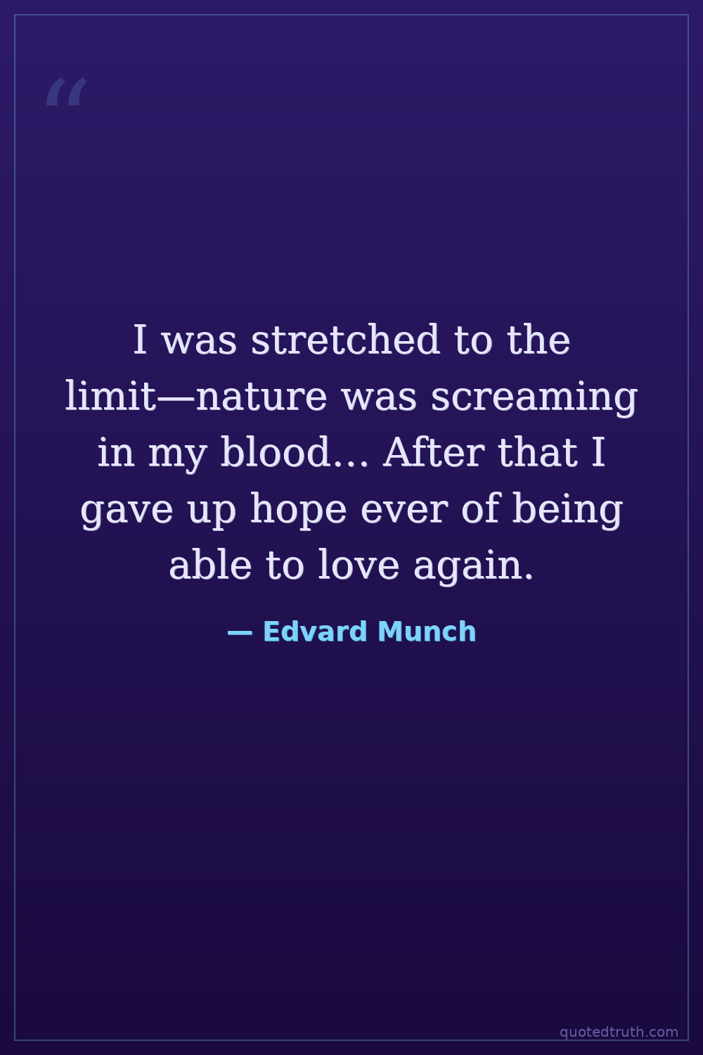 I was stretched to the limit—nature was screaming in my blood… After that I gave up hope ever of being able to love again.