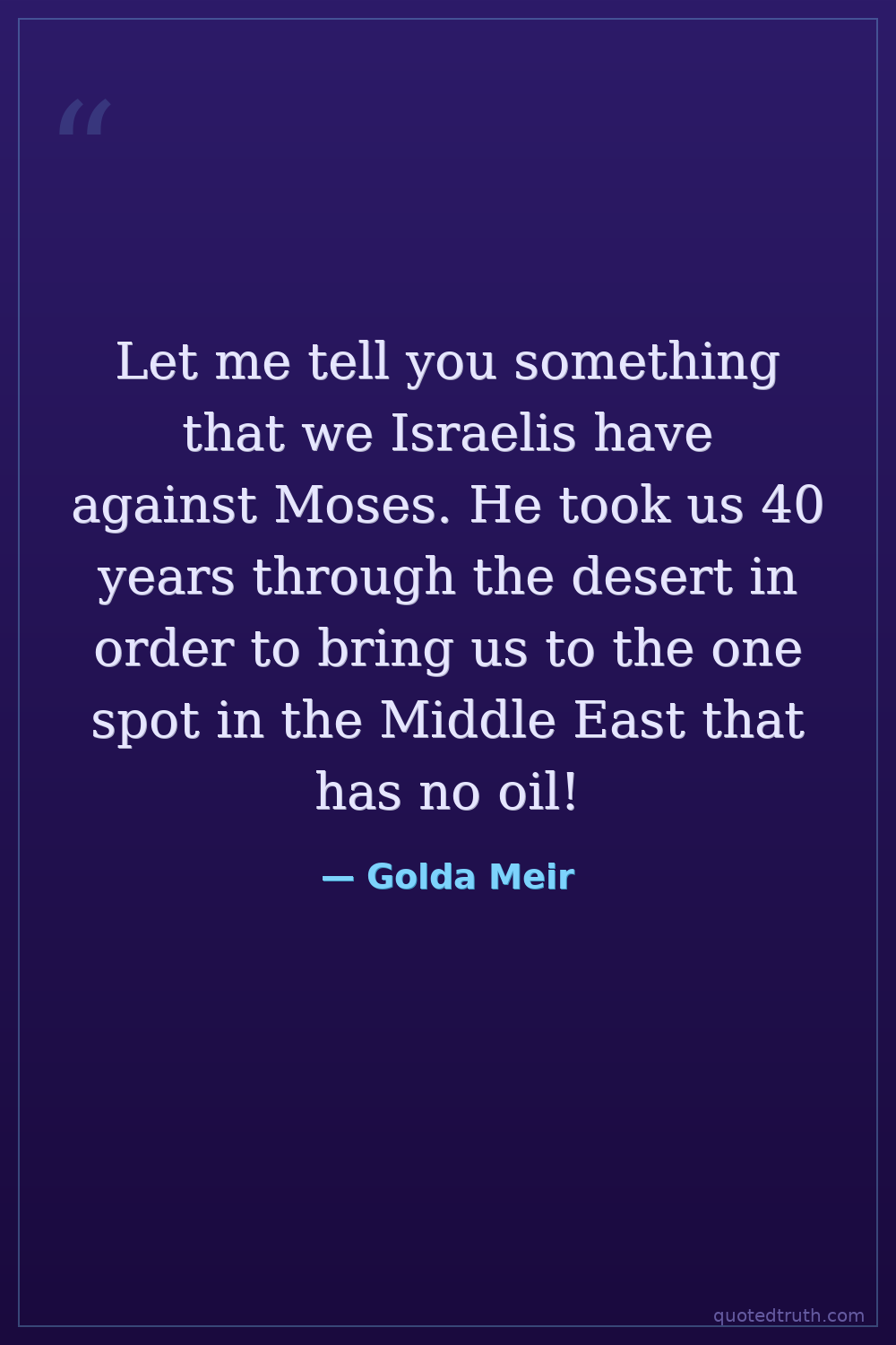 Let me tell you something that we Israelis have against Moses. He took us 40 years through the desert in order to bring us to the one spot in the Middle East that has no oil!