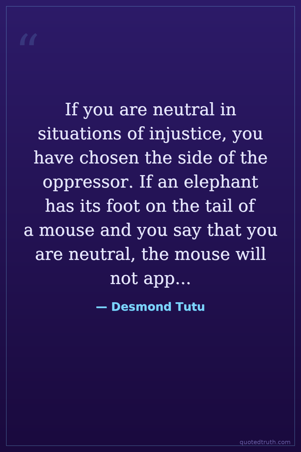 If you are neutral in situations of injustice, you have chosen the side of the oppressor. If an elephant has its foot on the tail of a mouse and you say that you are neutral, the mouse will not appreciate your neutrality.