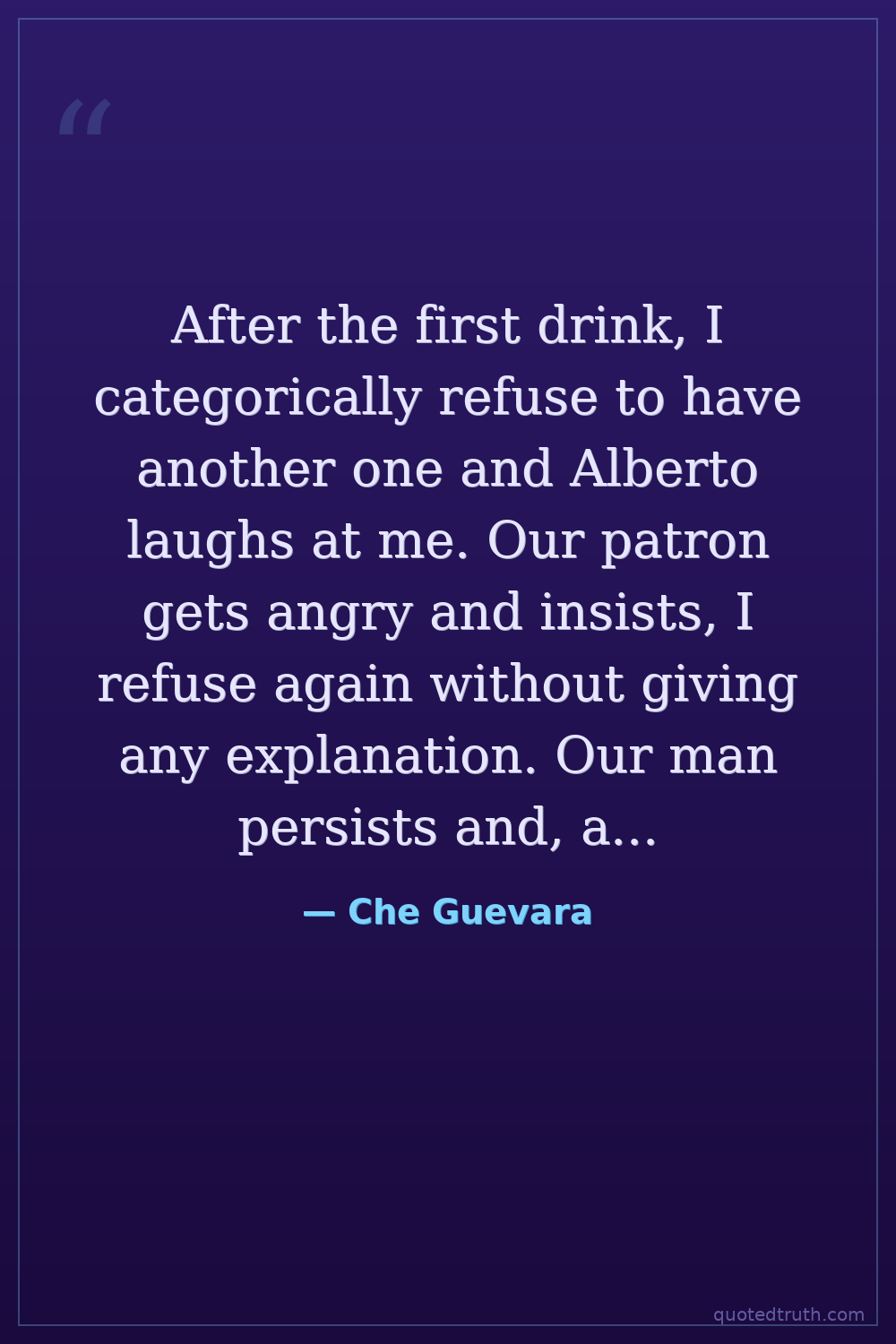 After the first drink, I categorically refuse to have another one and Alberto laughs at me. Our patron gets angry and insists, I refuse again without giving any explanation. Our man persists and, at that moment, I confess to him all confused that in Argentina we are used to drink while eating. The amount of food obviously depends on the client's head, but our technique is well established.