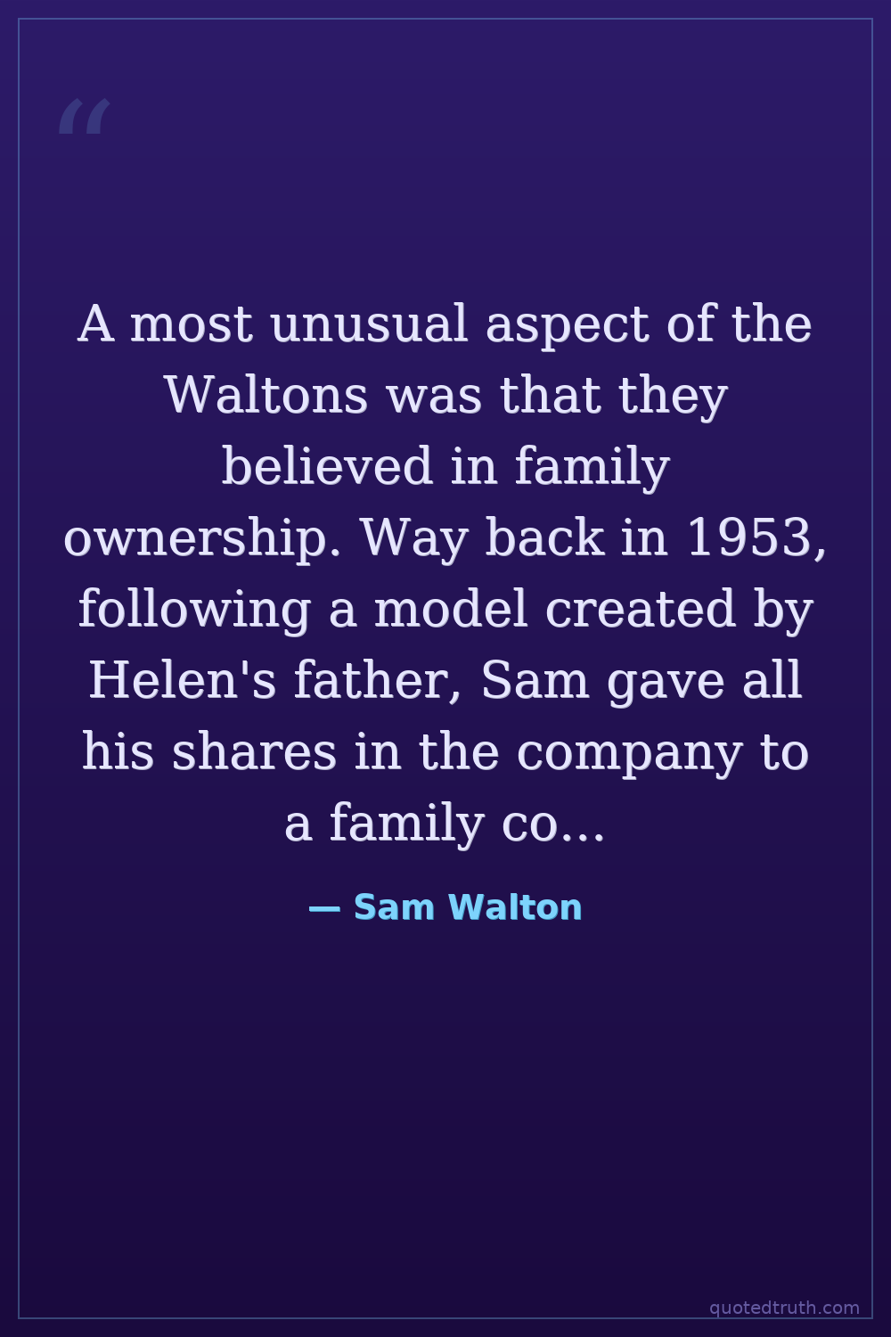 A most unusual aspect of the Waltons was that they believed in family ownership. Way back in 1953, following a model created by Helen's father, Sam gave all his shares in the company to a family corporation... Sam continuously worried that his kids and grandkids would get into fights like rich kids often do.